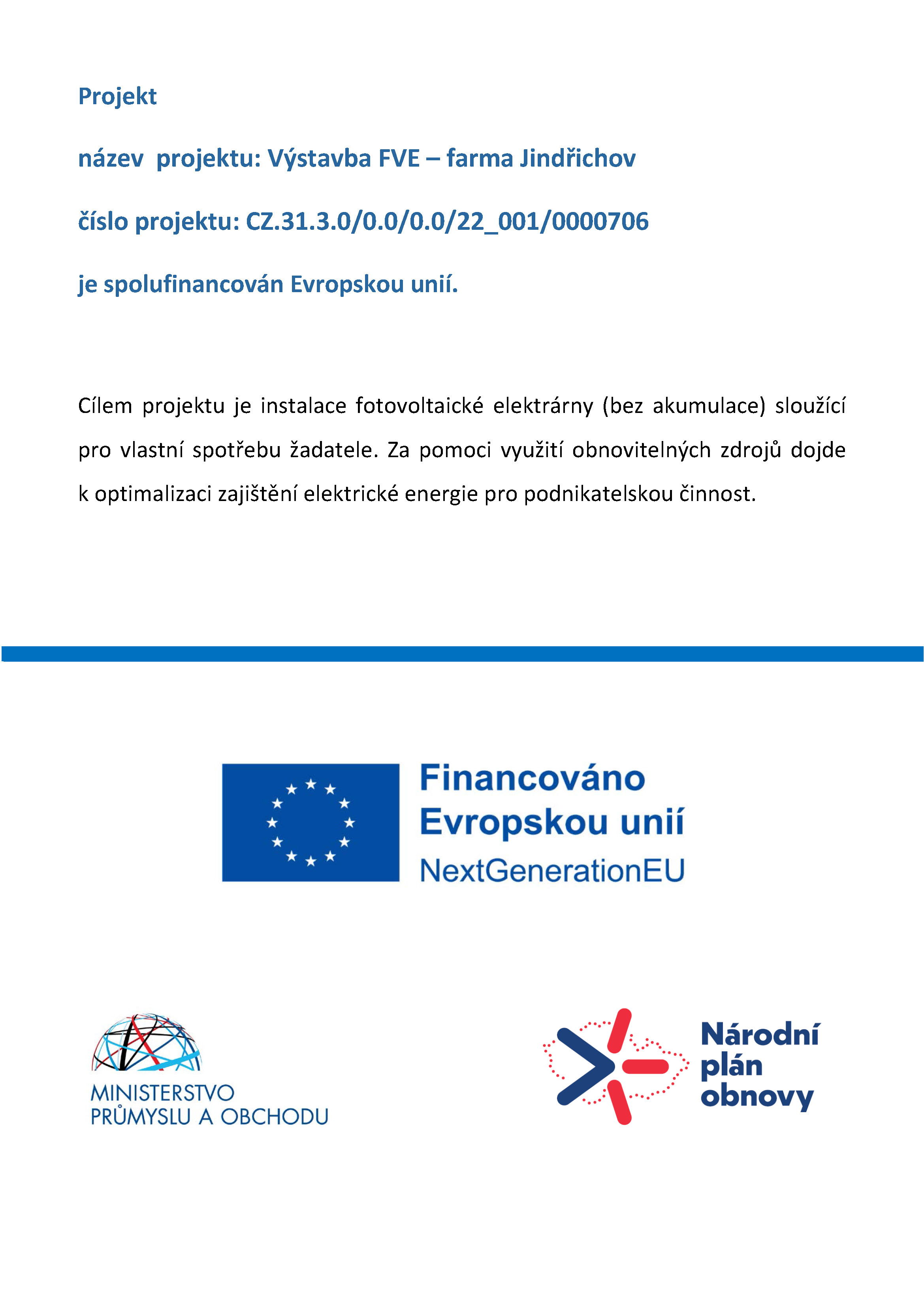 je spolufinancován Evropskou unií. Fotovoltaická elektrárna (FVE) je o instalovaném výkonu 990 kW (bez akumulace). Adresa místa realizace: k. ú. Jindřichov u Tršnic , obec Cheb, okres Cheb. Parcelní čísla budov na kterých je FVE umístněna je p.č. st. 59, st. 60. Cílem výstavby FVE je zajištění částečné energetické soběstačnosti podniku a snížení nákladů na elektrickou energii.